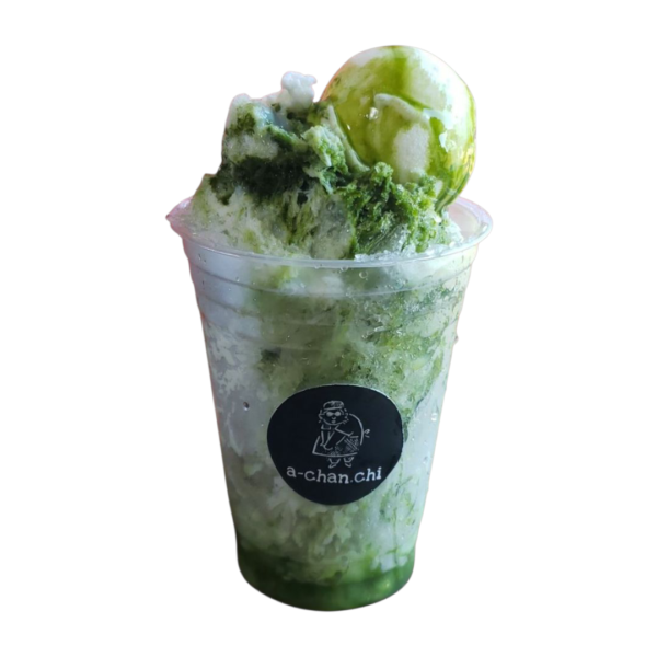 新富町の豊緑園さんの有機抹茶をたっぷり使った自家製抹茶シロップと練乳をたっぷりかけたかき氷に、新富町松浦牧場のアイスクリームをトッピングしております。